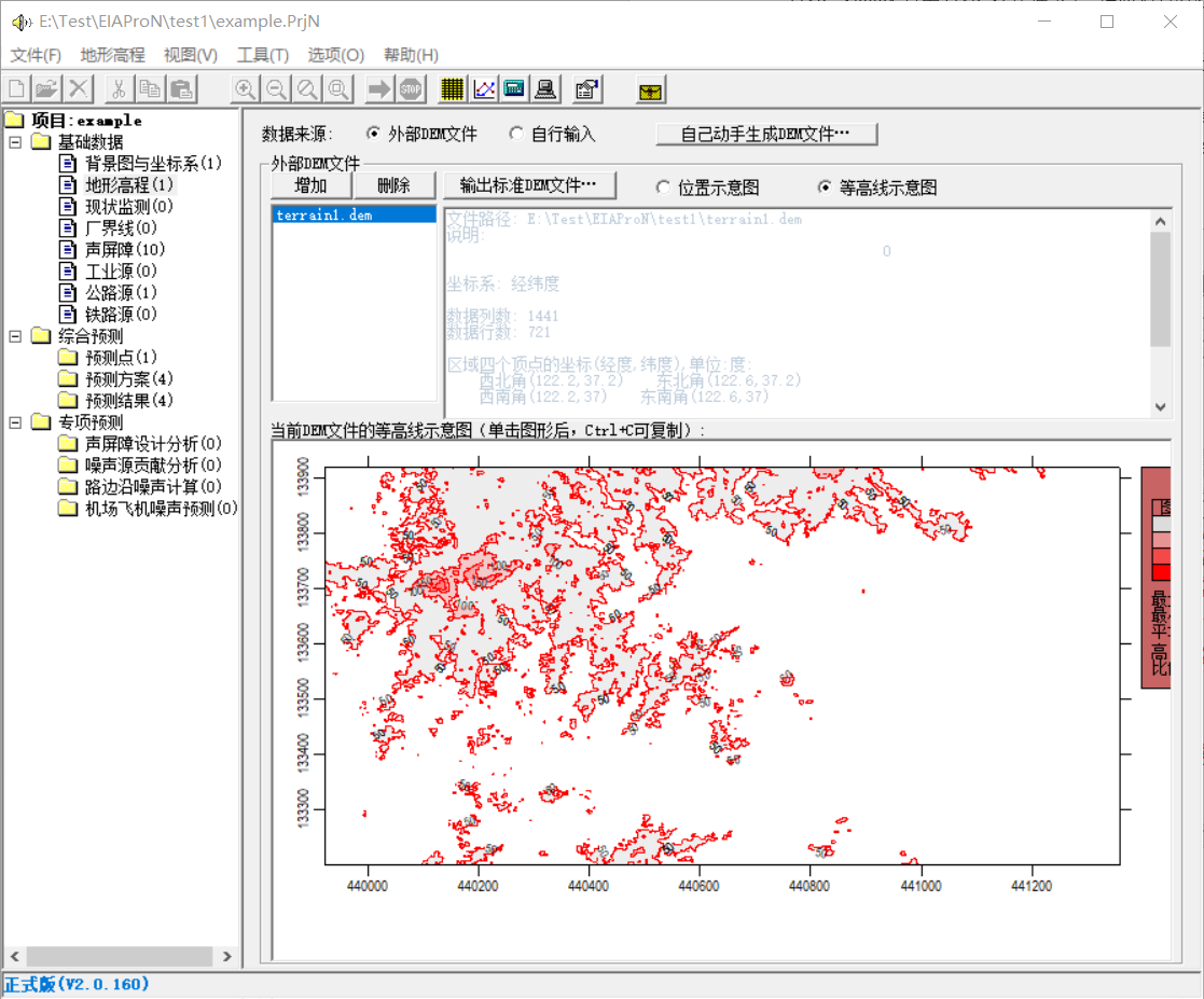 (2)软件运行的三要求,源,声屏障,预测点,应该匹配相同的地形高程数据/文件,或者全部都不输入和采用高程数据/文件。如果只是部分要素有地形高程,而部分没有,则计算的结果有可能是不合理的。比如部分或全部声源输入了高程值,部分或全部声屏障输入了高程值,对预测点没有匹配相同的地形高程文件等,这样计算出来都是不合理的(除非计算选项中没有选择“考虑地形高程”,这时所有要素的高程值都置为0)。