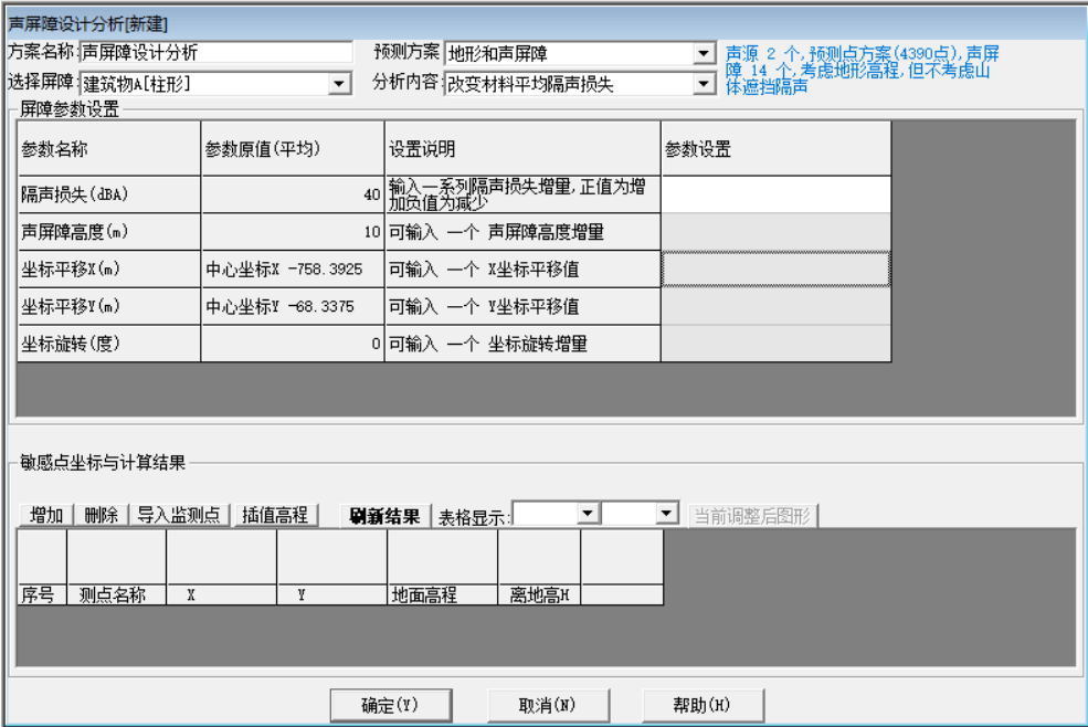 (1)预测方案定义窗口,参与的声屏障,简介栏目中,对建筑物,柱形或锥形的,地面中心坐标的第三个值,应显示建筑物基底的实际海拔高程,而不是高度相对坐标的0值,本版进行了改正。