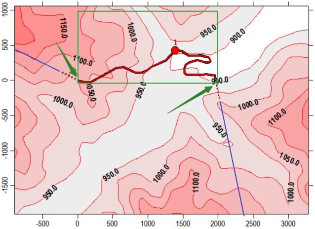 (3)举例:下图公路源位置及地形高程,公路两头绿色箭头所指均是可延伸的非终端点,则程序内部将按蓝色线所指将公路向外延伸到计算区域的外部,显然将与公路的实际走向相差很大,所以这些延伸线附近的预测点的结果是不可靠的。对于本图,如果要保持原有的黑色框的大计算区域,则应将公路两头分别增加一系列节点,使得最终其延伸点都位于黑色框外。如果不改变公路两头端点位置,那合理的预测点应位于图中的绿色方框内部。
